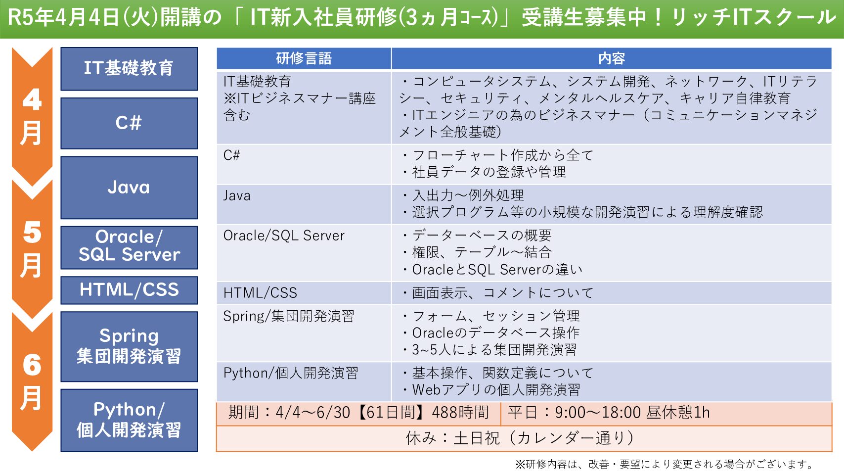 IT新入社員研修スケジュール【2023年4月~6月】 カテゴリ ニュース 日付 2022年7月1日 リッチITスクールではR5/4/4(火)よりIT新入社員研修(3ヵ月コース)を行います。名古屋金山で参加体験型の研修と講師による指導でキャリアを飛躍させましょう。詳しくはこちら。 IT新入社員研修とは お問い合わせ admin 前の投稿 <2022年春期>IT新入社員研修|成果発表会 2022年7月1日 次の投稿 情報セキュリティ基本方針の制定 2022年10月28日