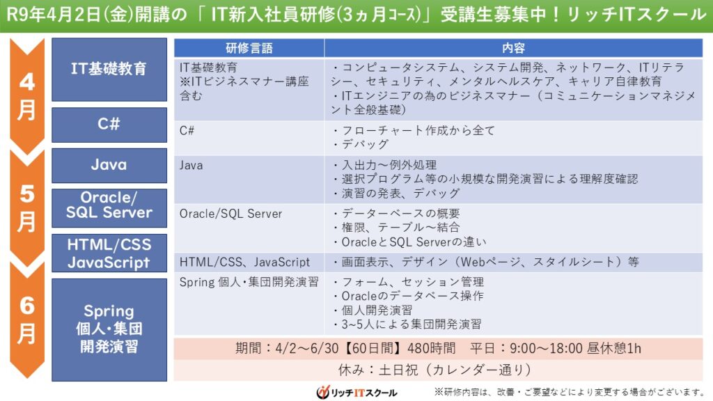 IT新入社員研修(3ヵ月コース)の内容は、
